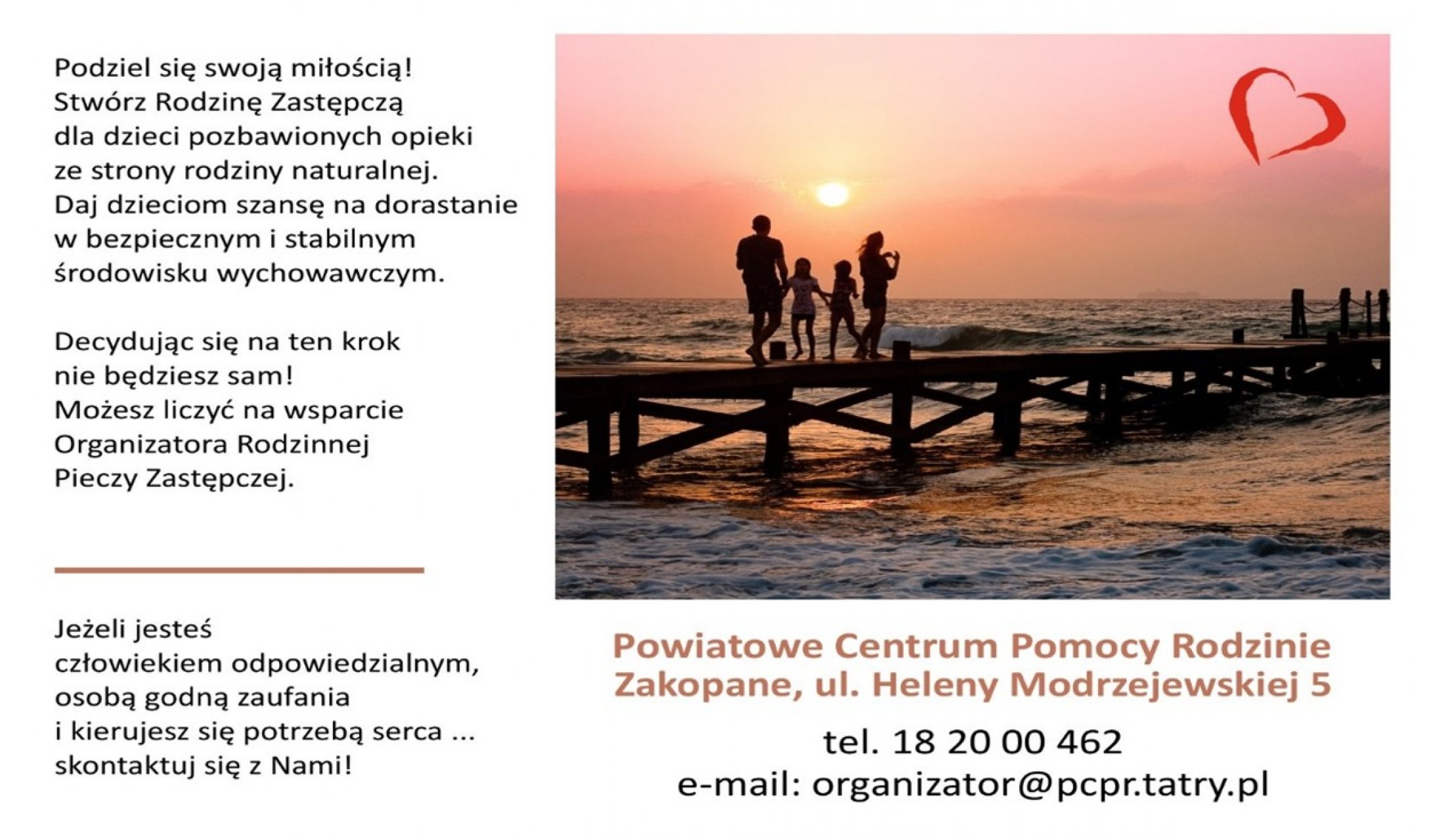 WSZYSTKIE OSOBY ZAINTERESOWANE PROSZONE SĄ O KONTAKT pod nr. tel. 18 20 00 462 wew. 27, mailowy organizator@pcpr.tatry.pl lub osobisty w siedzibie PCPR przy ul. Modrzejewskiej 5 w Zakopanem (budynek Internatu Zespołu Szkół Hotelarsko-Turystycznych - II piętro).