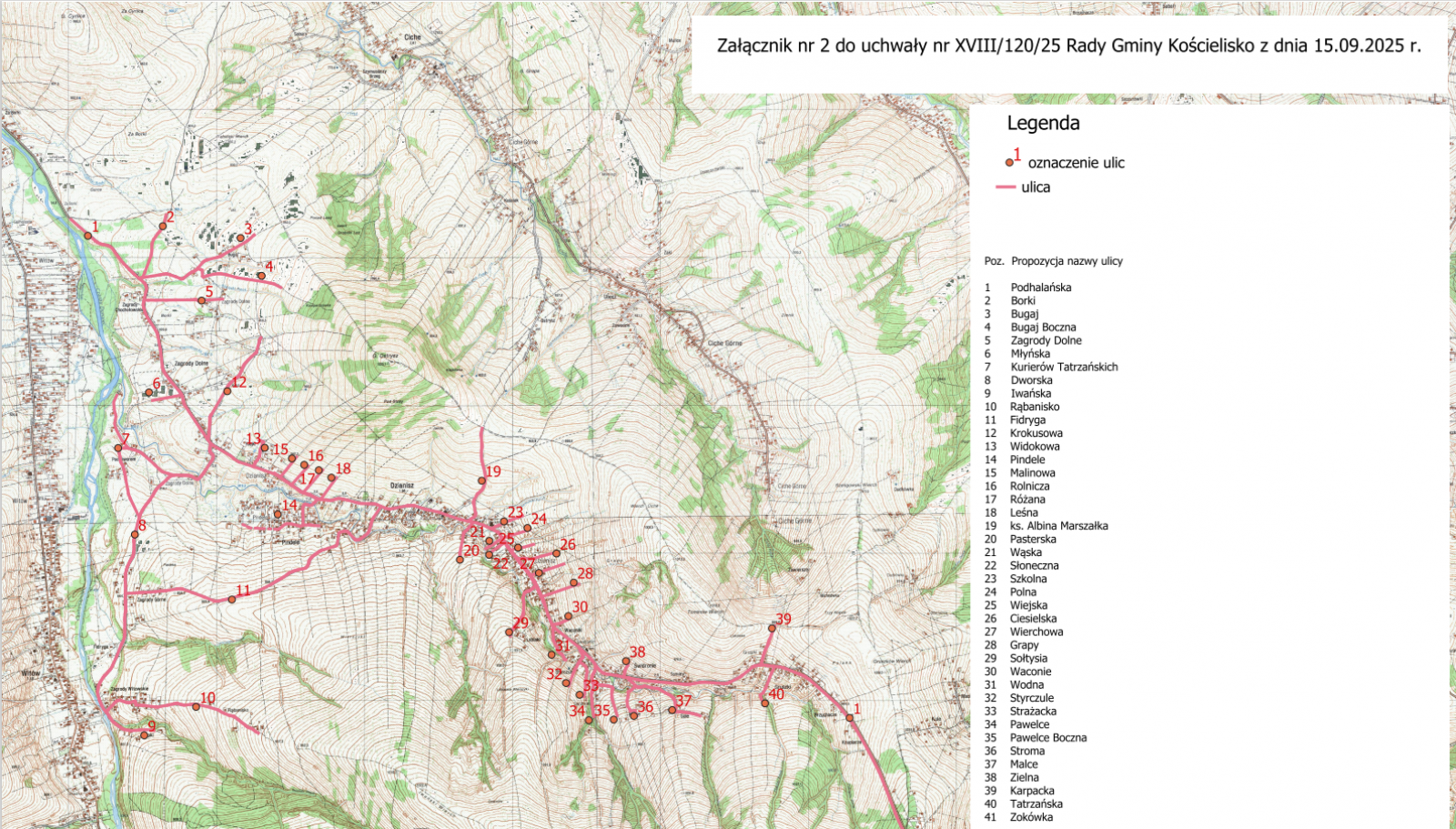Dnia 15.09.2025 r. Rada Gminy Kościelisko podjęła uchwałę nr XVIII/120/25 w sprawie nadania nazw ulicom w miejscowości Dzianisz w gminie Kościelisko. Uchwałę poprzedzały konsultacje społeczne, szereg spotkań radnych oraz Rady Sołeckiej. W sołectwie wyznaczono 41 ulic, których nazwy odnoszą się do lokalnego nazewnictwa lub związane są ze specyfiką regionalną, miejscem, jego historią. Przyporządkowanie numerów do danej ulicy wynikać będzie z lokalizacji istniejącego zjazdu do budynku. Wprowadzenie ulic i nowa numeracja budynków jest konieczna ze względów porządkowych i bezpieczeństwa.